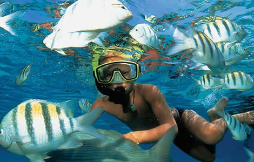 You will be transferred to the jetty to have a fantastic snorkeling trip by boat to Giftun island on the beautiful Red Sea, on your trip you will do snorkeling in different spots where you will find beautiful coral reefs and magnificent colorful fish, also you may have the chance to swim with dolphins, or to see them swimming around your boat. Enjoy the water sports activities or have a sunbath on Giftun Island and the national park, have fun with Banana Boat & quarto. You will have open buffet Sea Food lunch on board the boat, a bottle of water, hot drinks are available on the boat, including snorkeling equipment (mask & fins)
